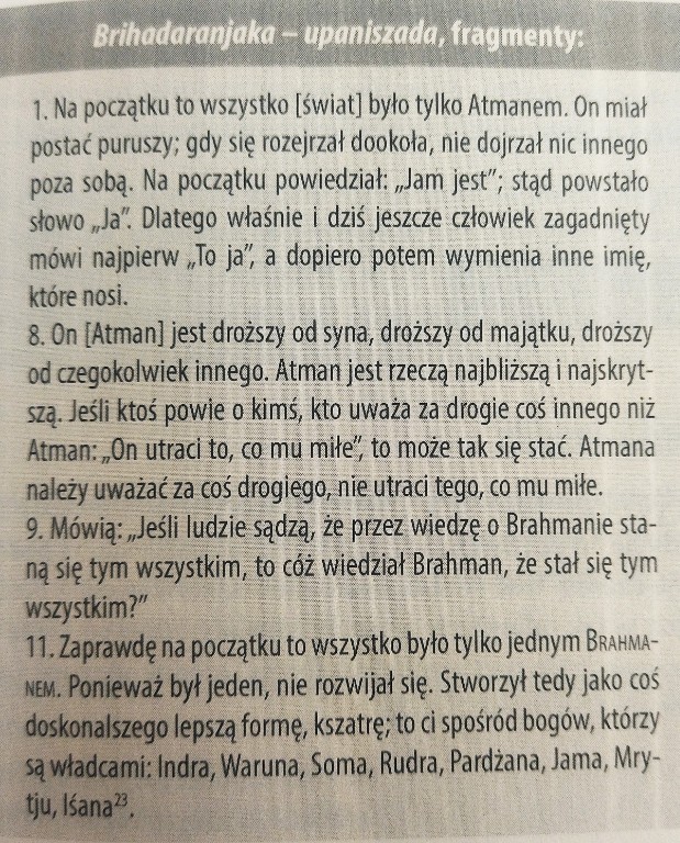 Odpowiedź pojawia się w filozoficznych tekstach zwanych Upaniszady. Według nich za różnorodnością świata stoi Brahman – absolutna rzeczywistość. Brahman to nieskończona rzeczywistość, źródło wszystkiego, co istnieje, a zarazem świadomość i byt. W Upaniszadach czytamy o nim słowa: